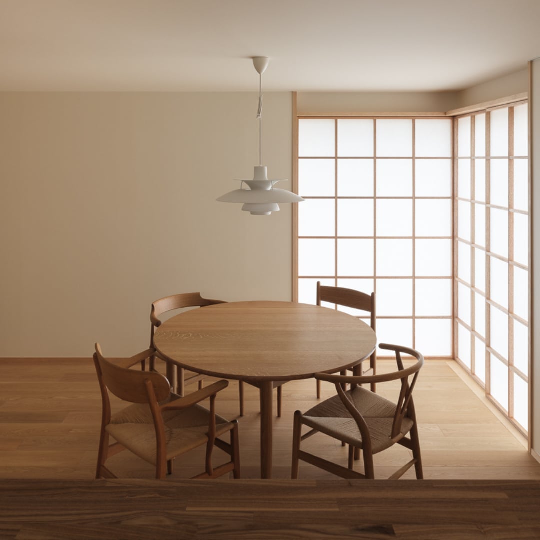 ナラ無垢材の素朴で落ち着いた風合いは、木や紙を大切にする日本の空間にもしっくり馴染みます。直線的で軽やかなフォルムは、和のミニマルな美しさとも相性が良く、モダンな和室ダイニングとしてもおすすめです。