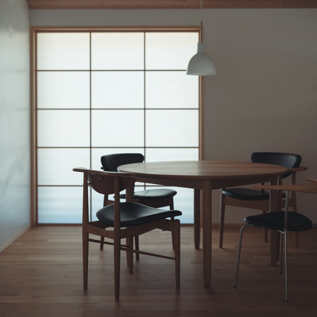 ナラ無垢材の素朴で落ち着いた風合いは、木や紙を大切にする日本の空間にもしっくり馴染みます。直線的で軽やかなフォルムは、和のミニマルな美しさとも相性が良く、モダンな和室ダイニングとしてもおすすめです。