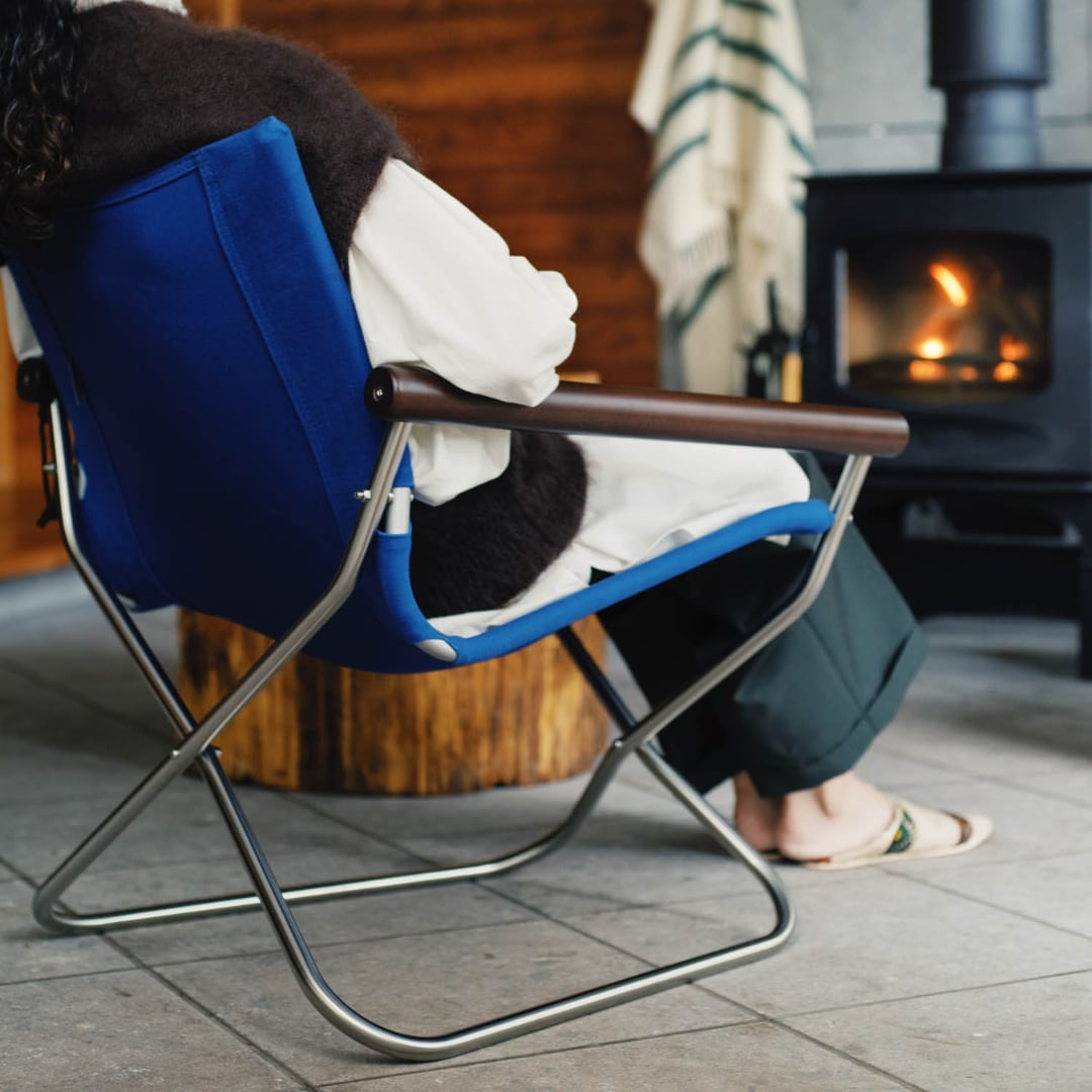 折り畳み椅子であることを忘れる座り心地の良さは、考え抜かれた肘かけの高さや角度、自然と腰を支える背もたれのカーブ、足の裏がしっかりつく座面高に隠されています。さらに、ニーチェアエックス専用に織られた伸縮性のある厚手の生地は身体にしっかりとフィットし、包み込まれるような座り心地を実現しています。