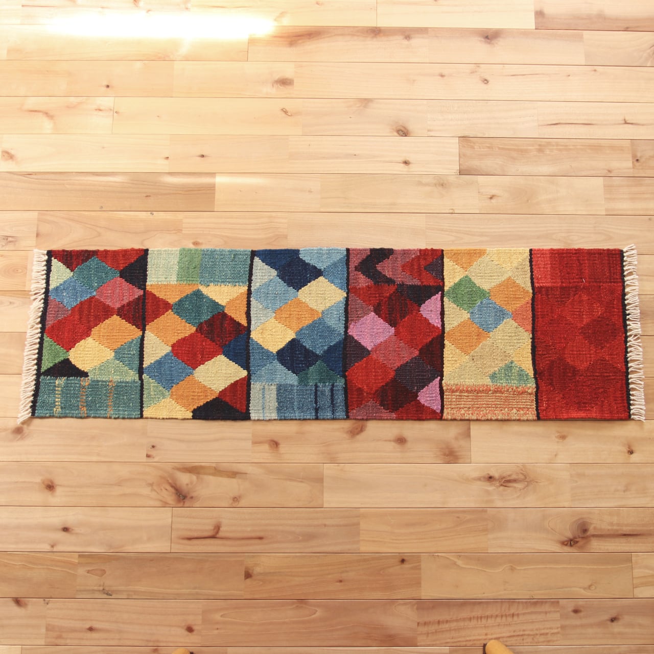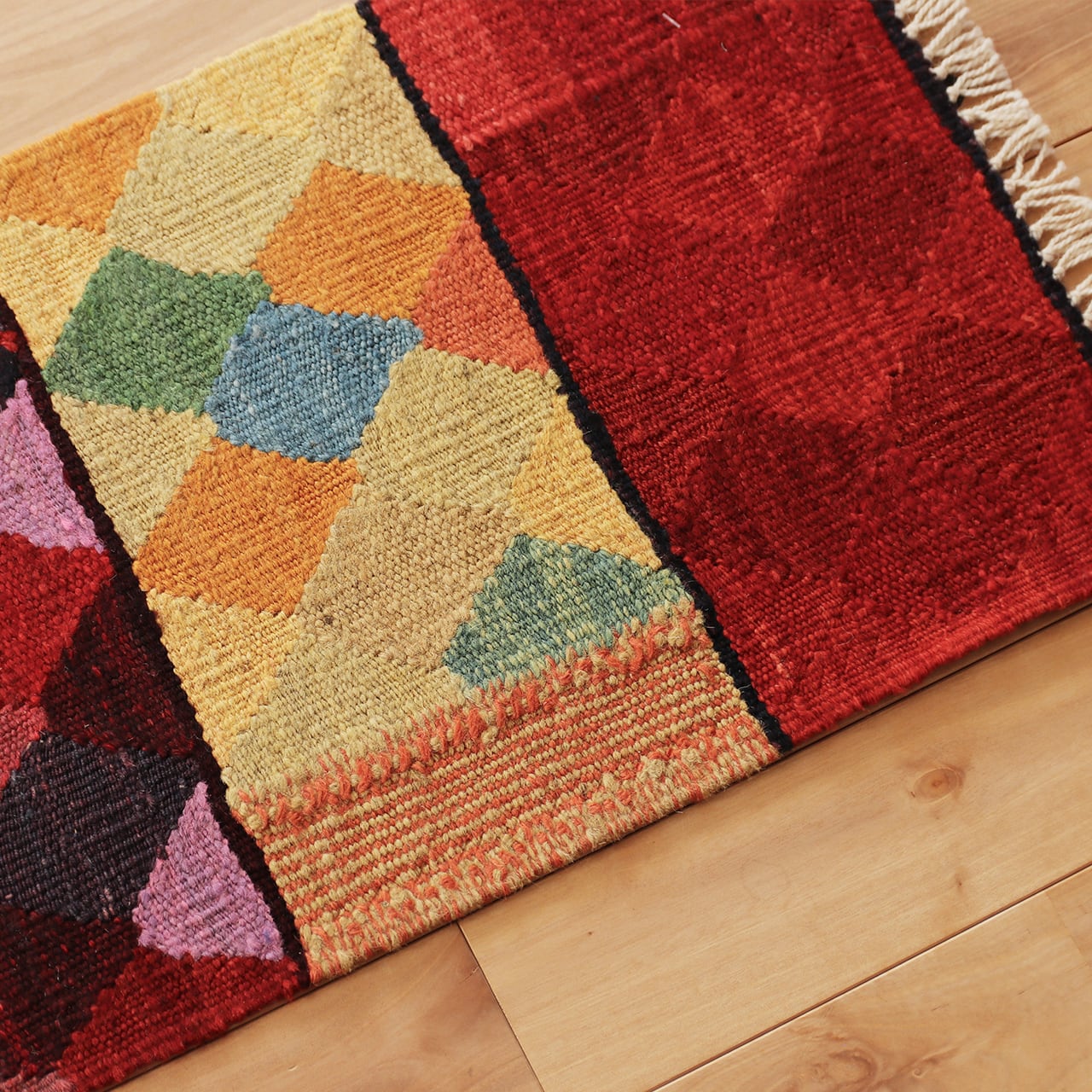 カラフルな紋様がリズム良く並んだ、華やかな「ロゴバキリム」です。