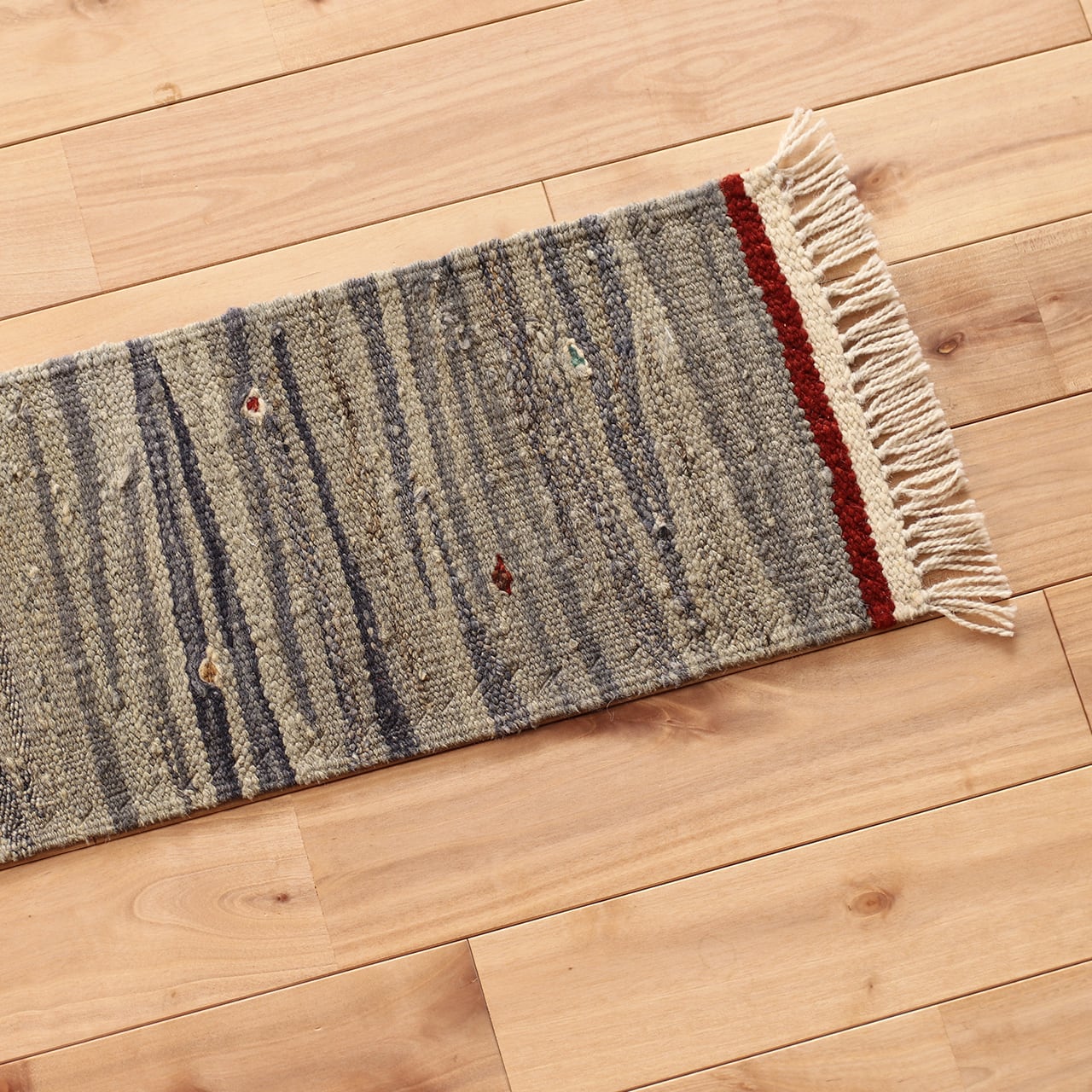 ロゴバキリムの最大の特徴『アブラッシュ』(糸の色の濃淡や太さのゆらぎ)が、石染めのウールによって豊かに表現されています。両端にデザインされた赤のラインが、このキリムを引き締めるアクセントに。手仕事ならではの素朴さと、生き生きとした生命力を感じさせる仕上がりです。