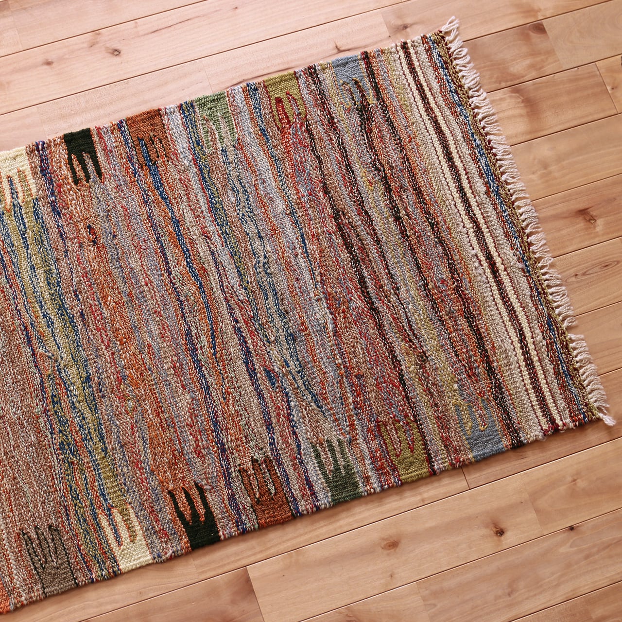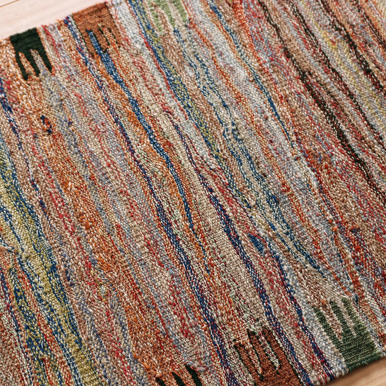 ロゴバキリムの真骨頂である「アブラッシュ(糸の色の濃淡や太さのゆらぎ)」が、マルチカラーによって一層生き生きと表現されています。