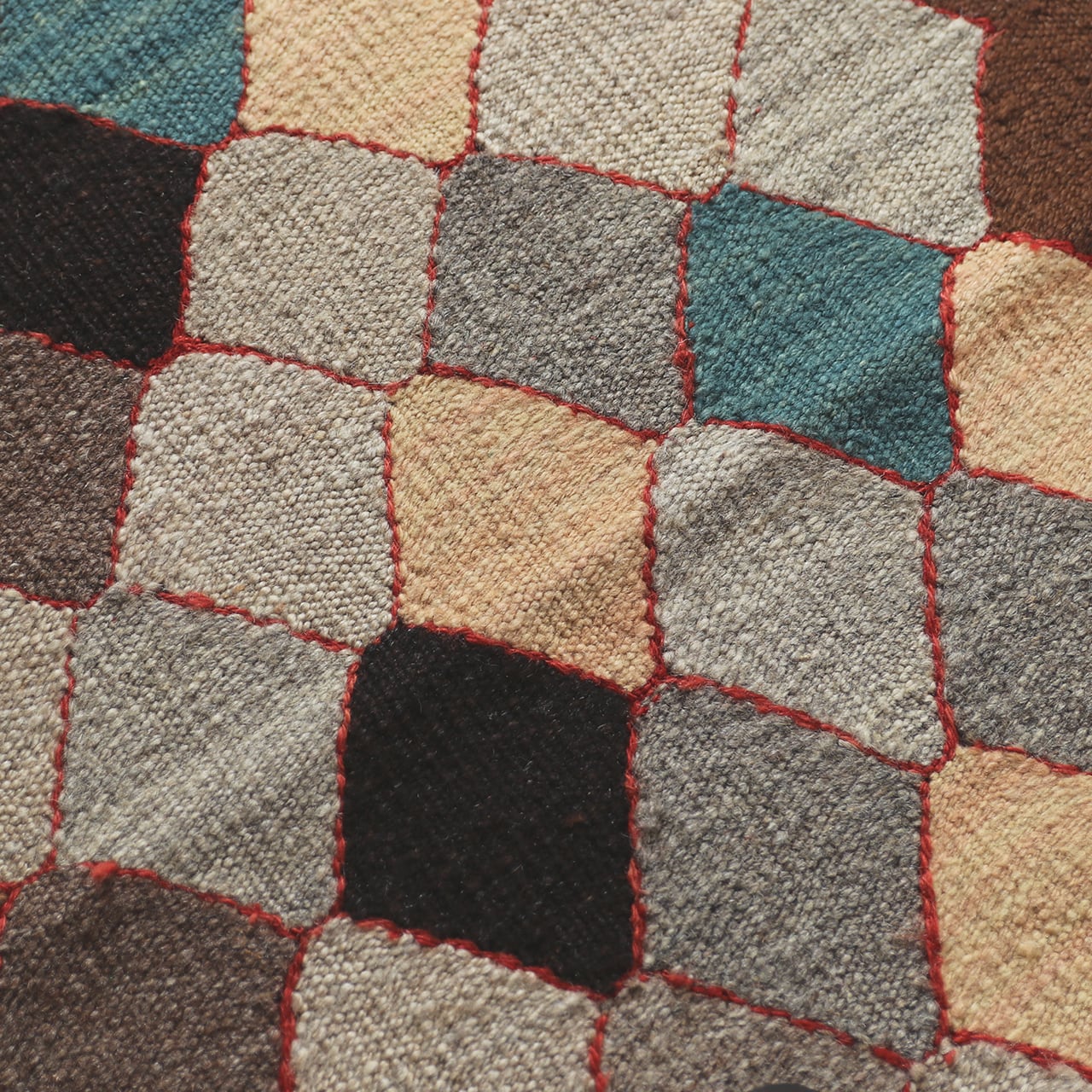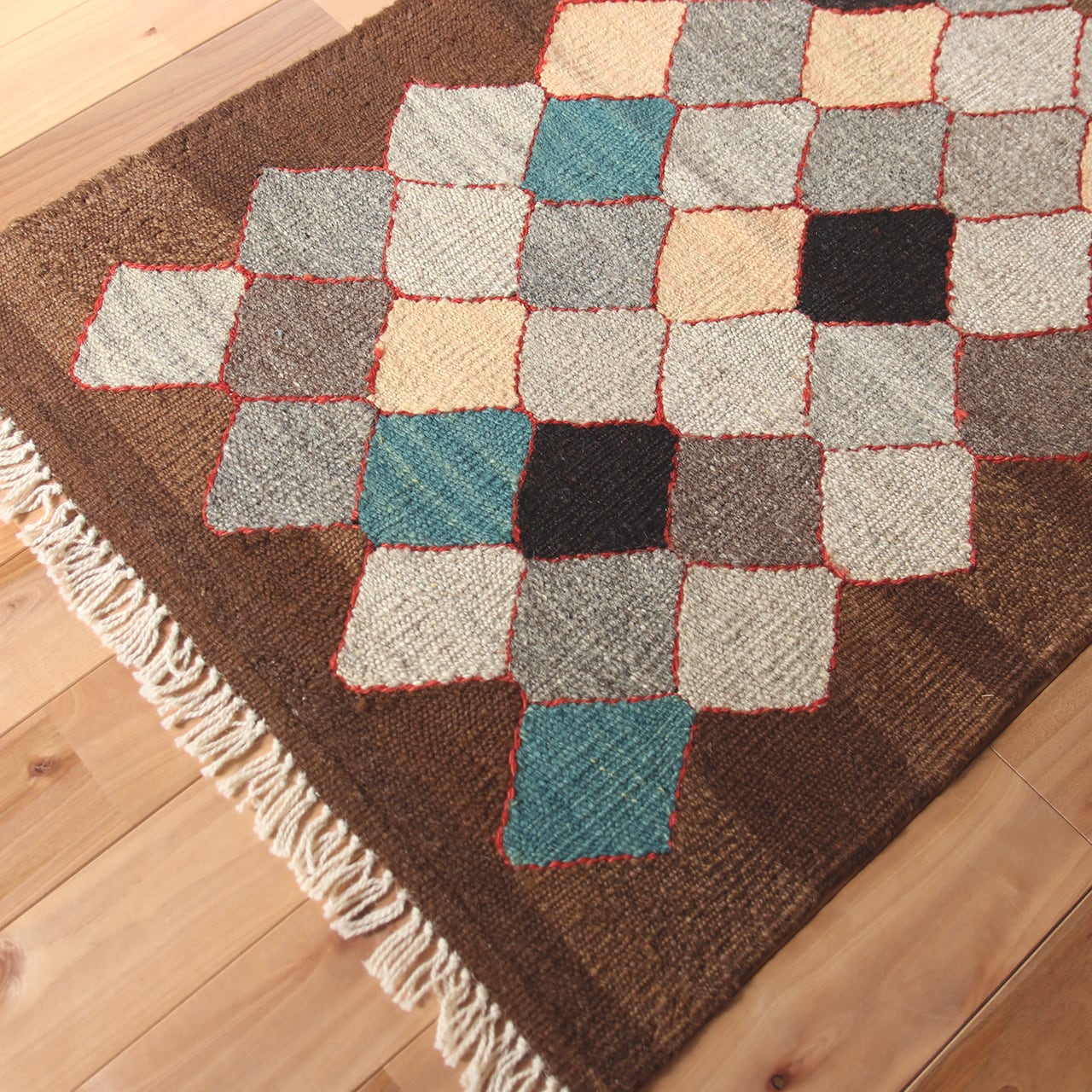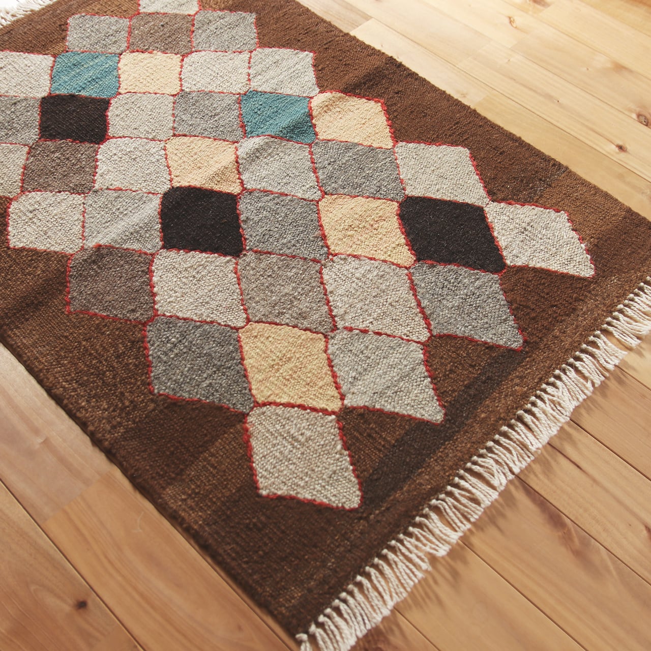 ブラウンやグレーなどの落ち着いたトーンの中に、リズム良く並ぶダイヤモンドパターン。現代アートのような洗練された佇まいが魅力の「ロゴバキリム」です。