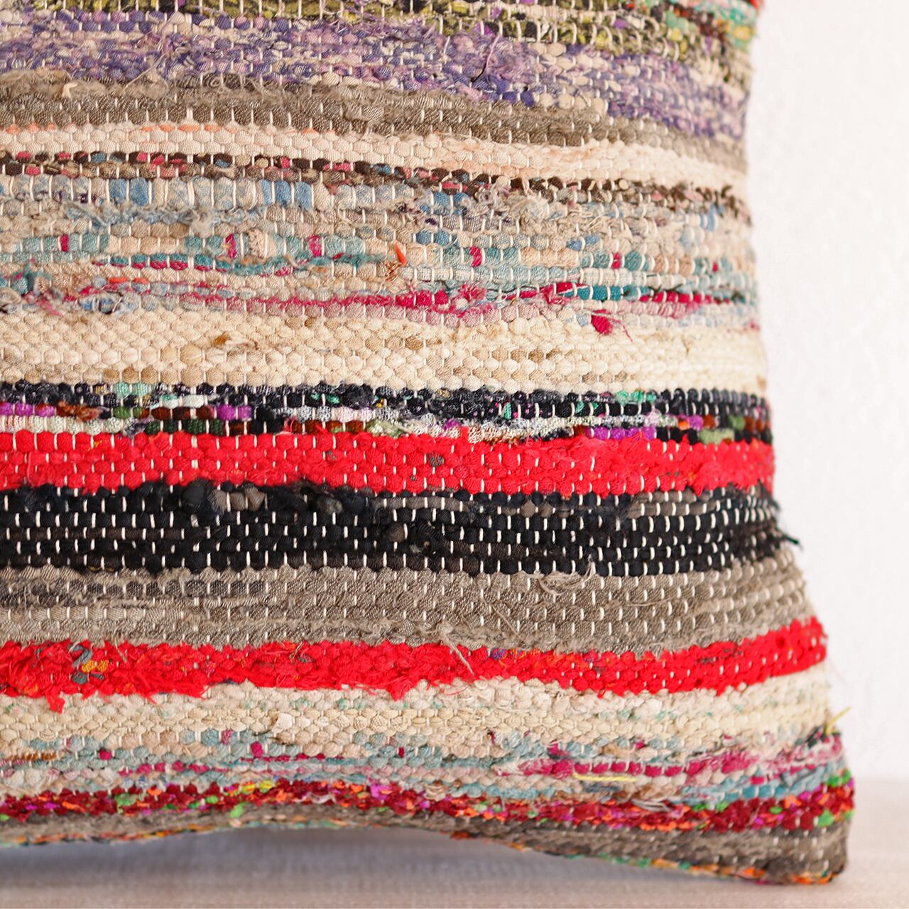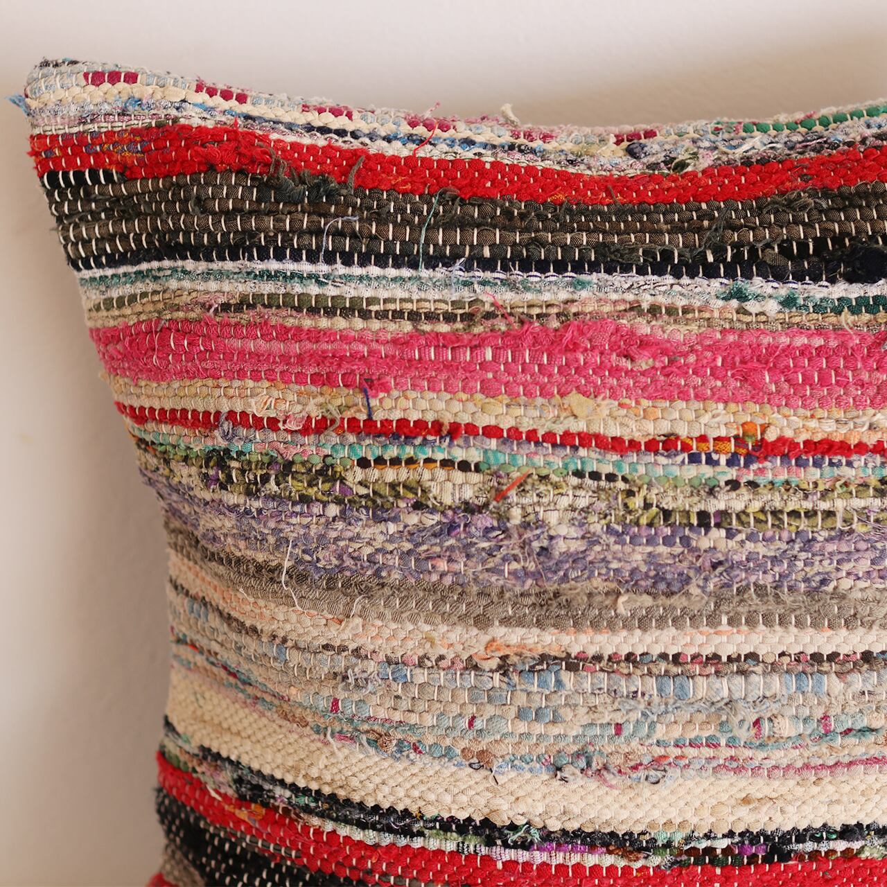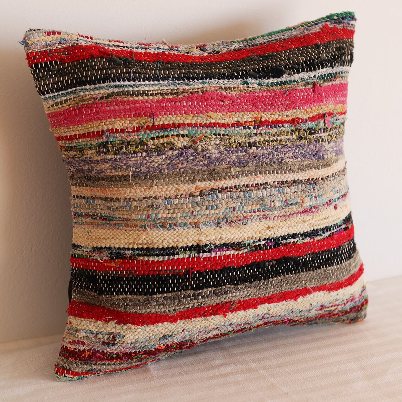 それらを細かく裂き、再び丁寧に織り上げる「裂き織り」の技法で仕上げられたクッションカバーです。