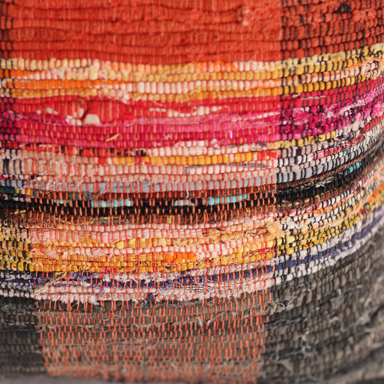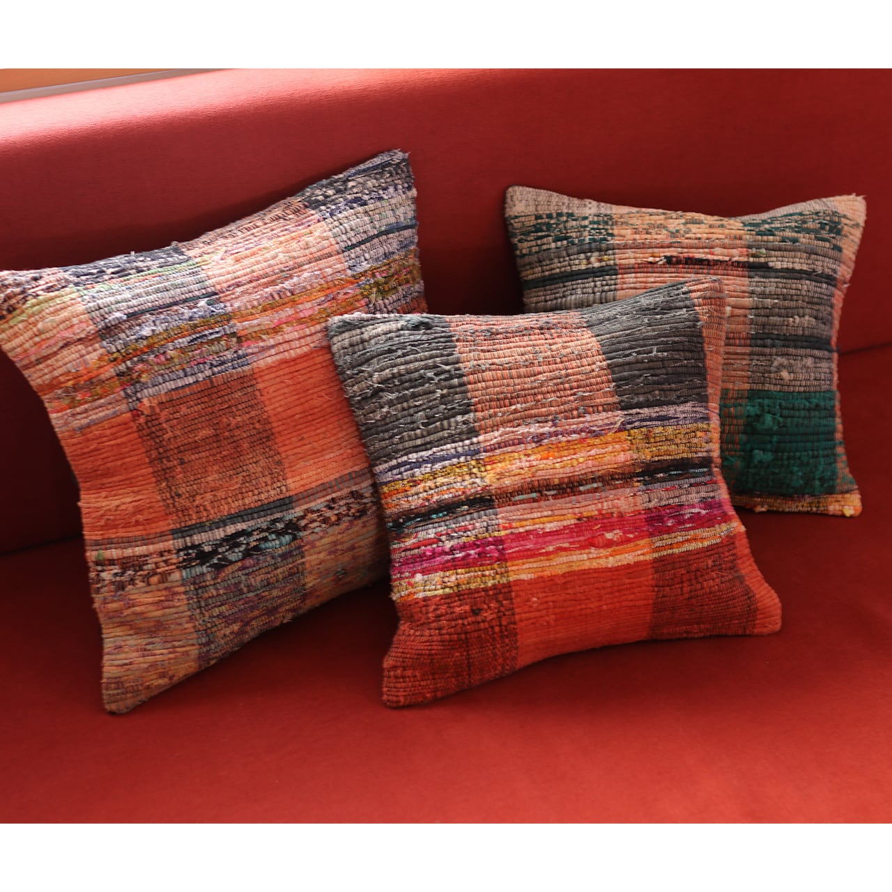 それらを細かく裂き、再び丁寧に織り上げる「裂き織り」の技法で仕上げられたクッションカバーです。