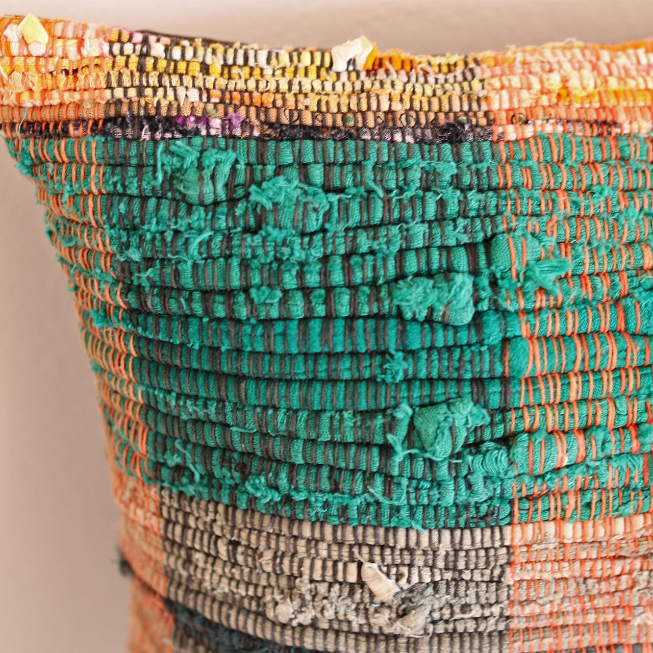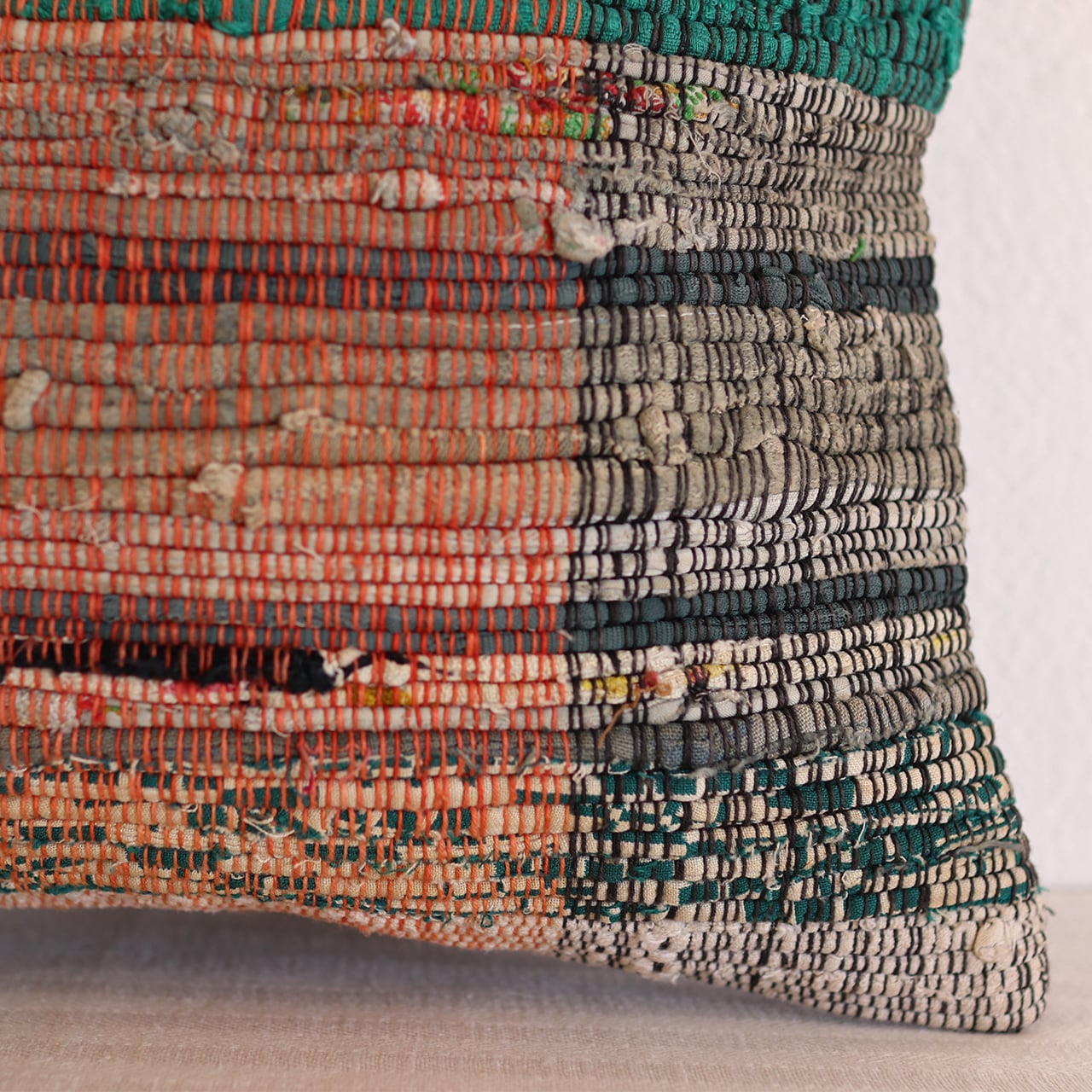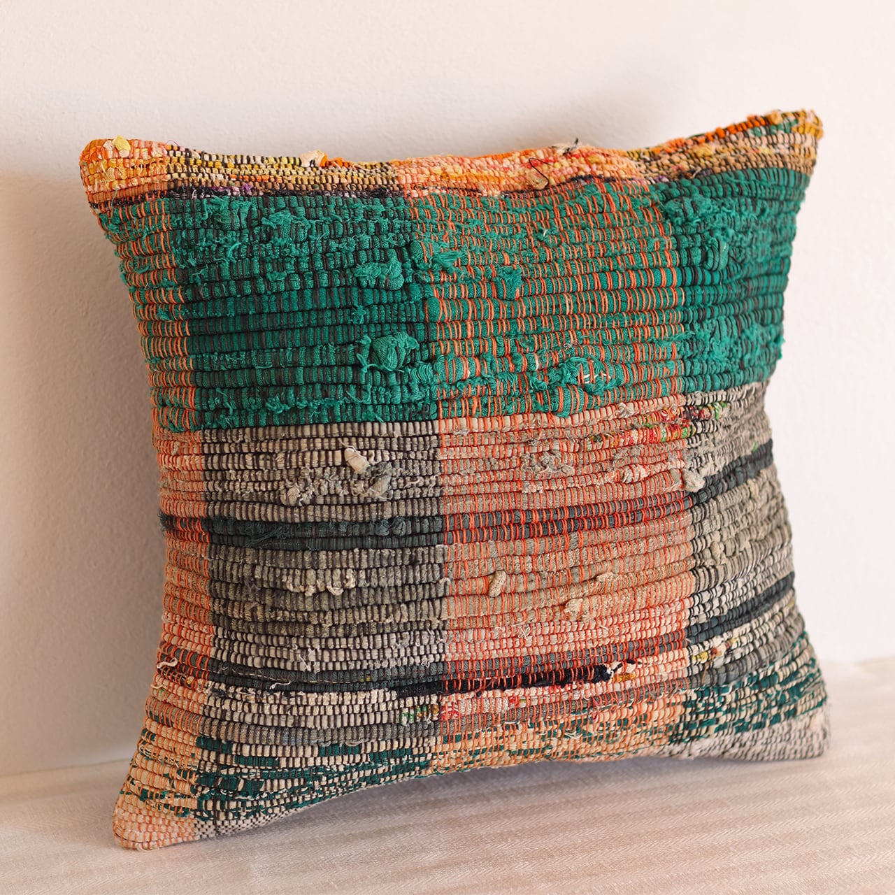 それらを細かく裂き、再び丁寧に織り上げる「裂き織り」の技法で仕上げられたクッションカバーです。