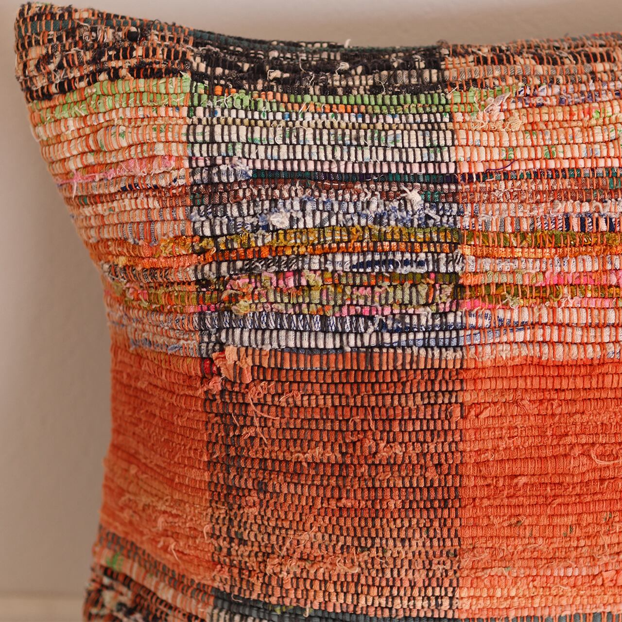 それらを細かく裂き、再び丁寧に織り上げる「裂き織り」の技法で仕上げられたクッションカバーです。