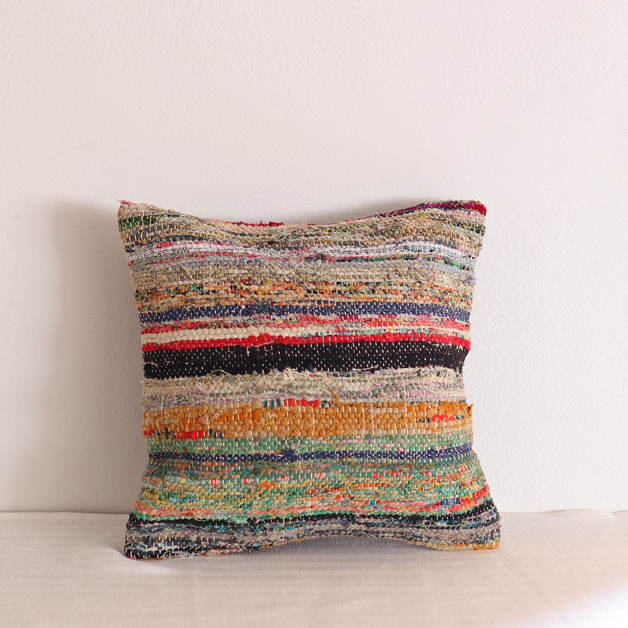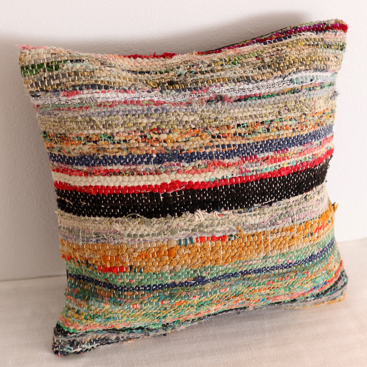 それらを細かく裂き、再び丁寧に織り上げる「裂き織り」の技法で仕上げられたクッションカバーです。
