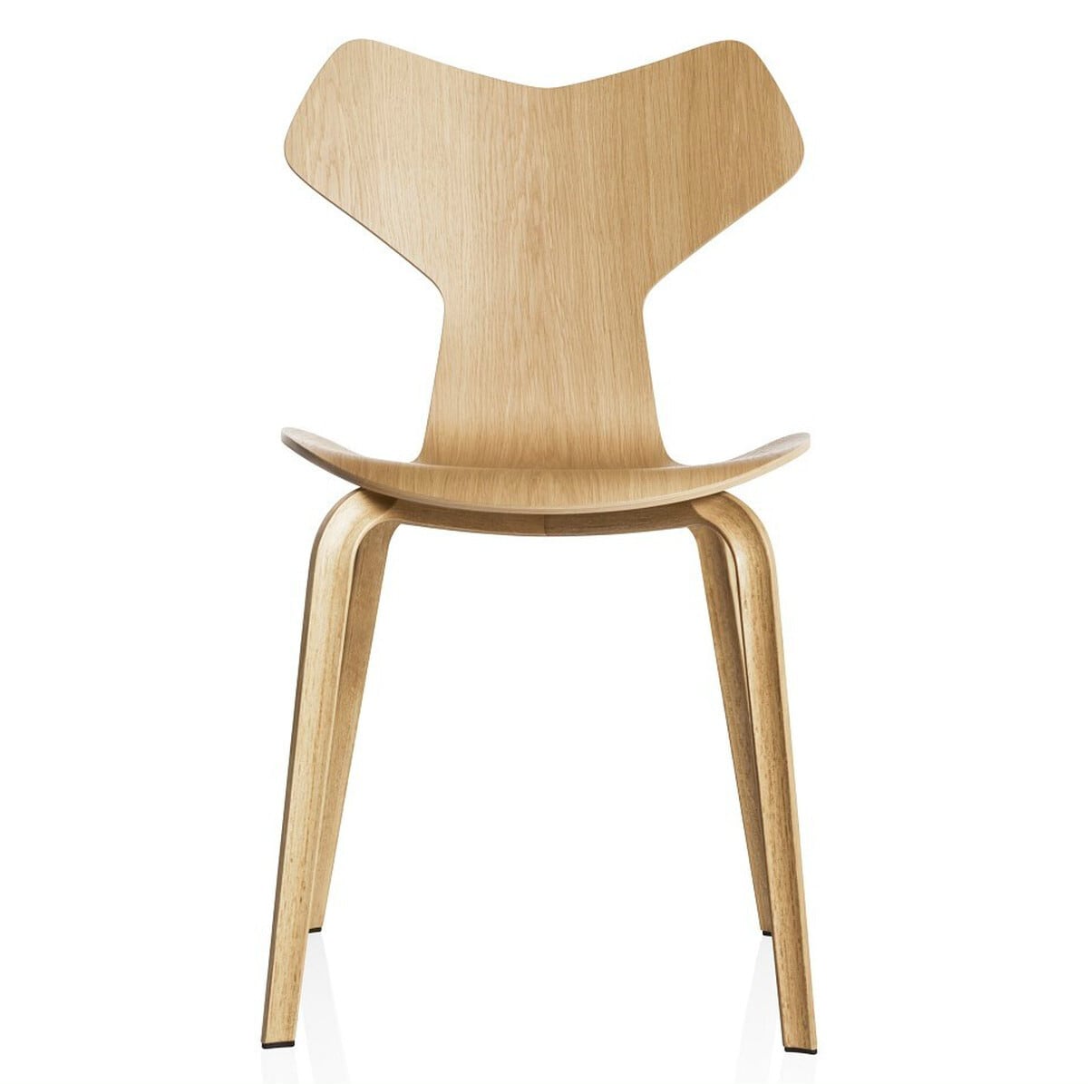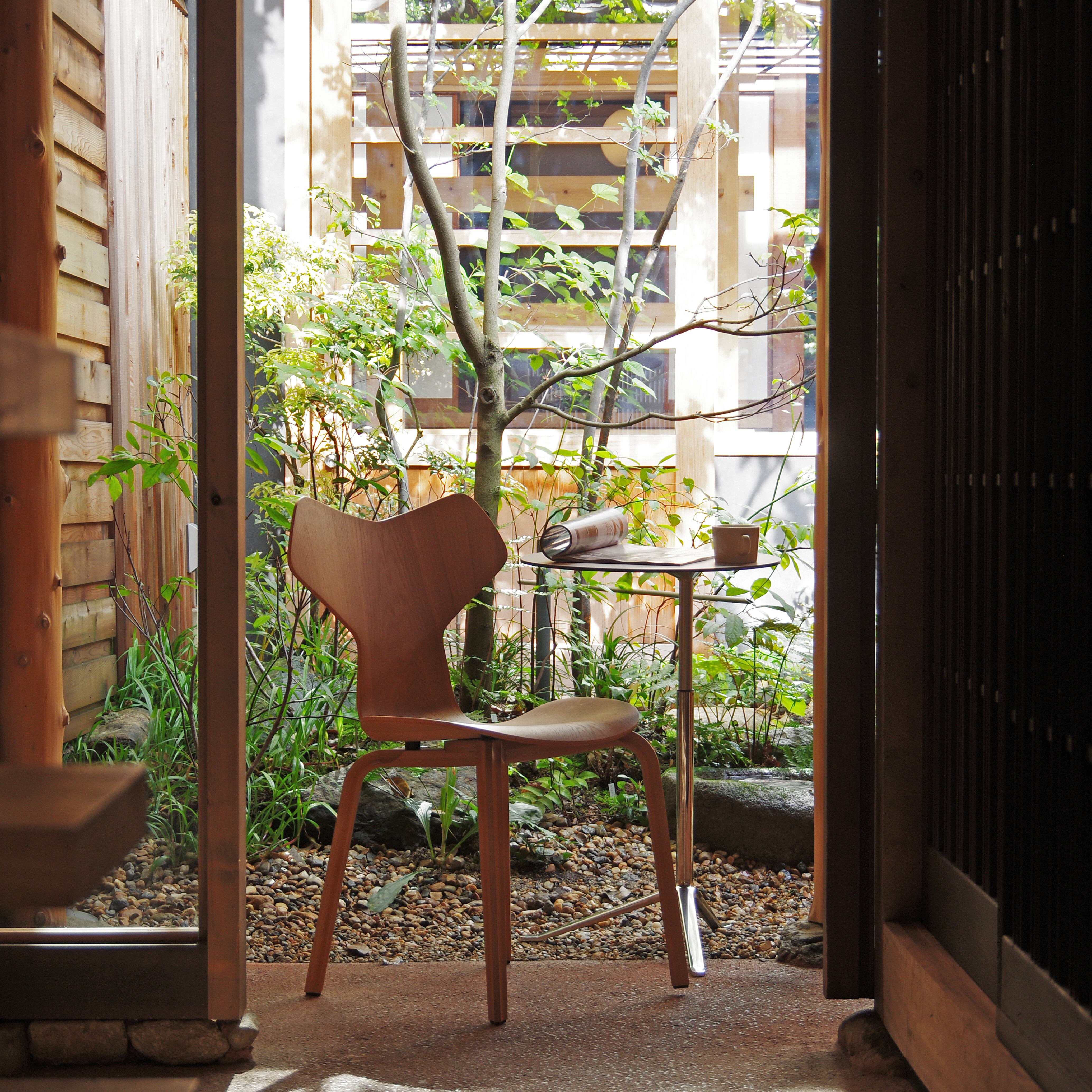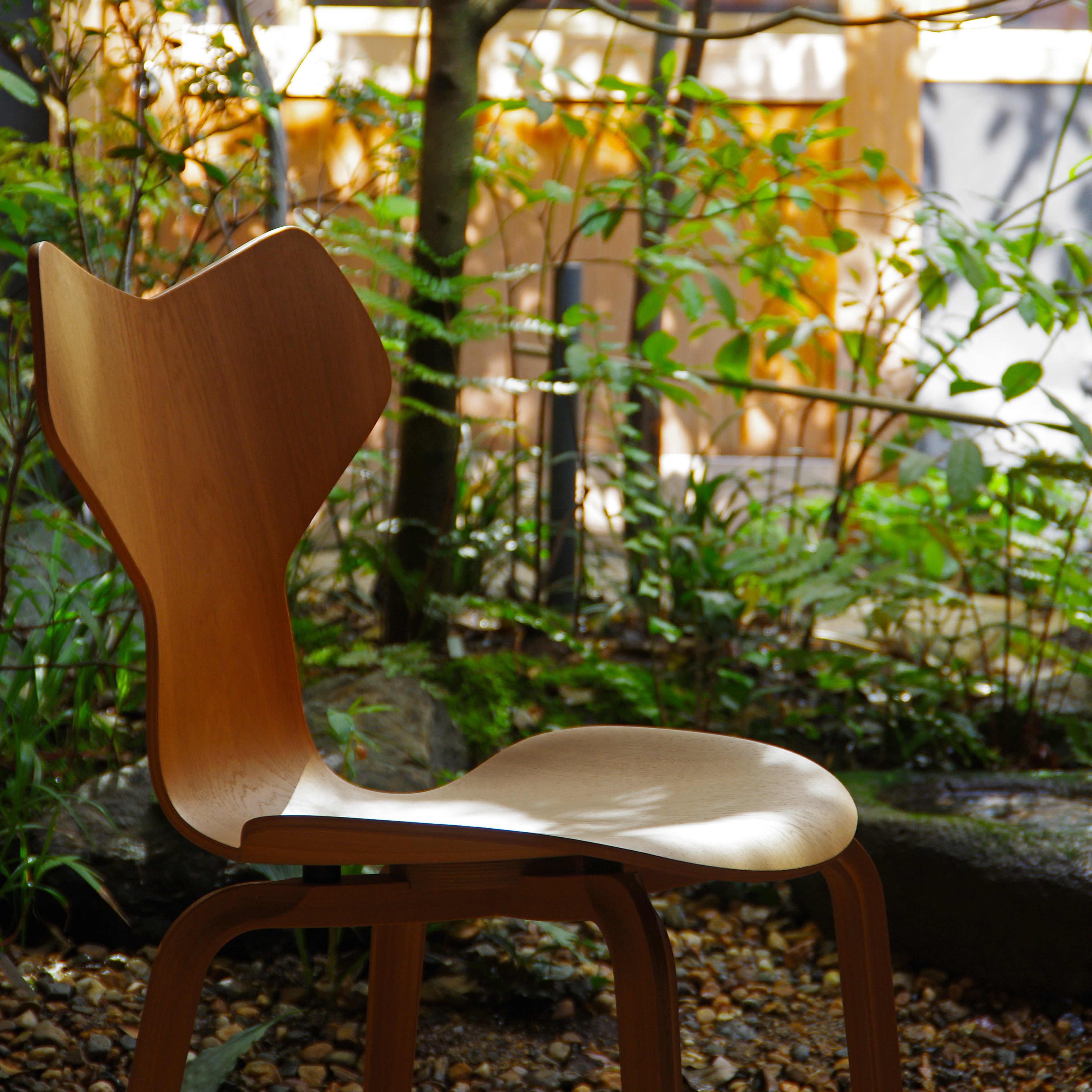 グランプリチェアは背と座が一体となった成形合板のカーブが、背中に自然にフィットし、長時間座っていても疲れにくい設計です。
