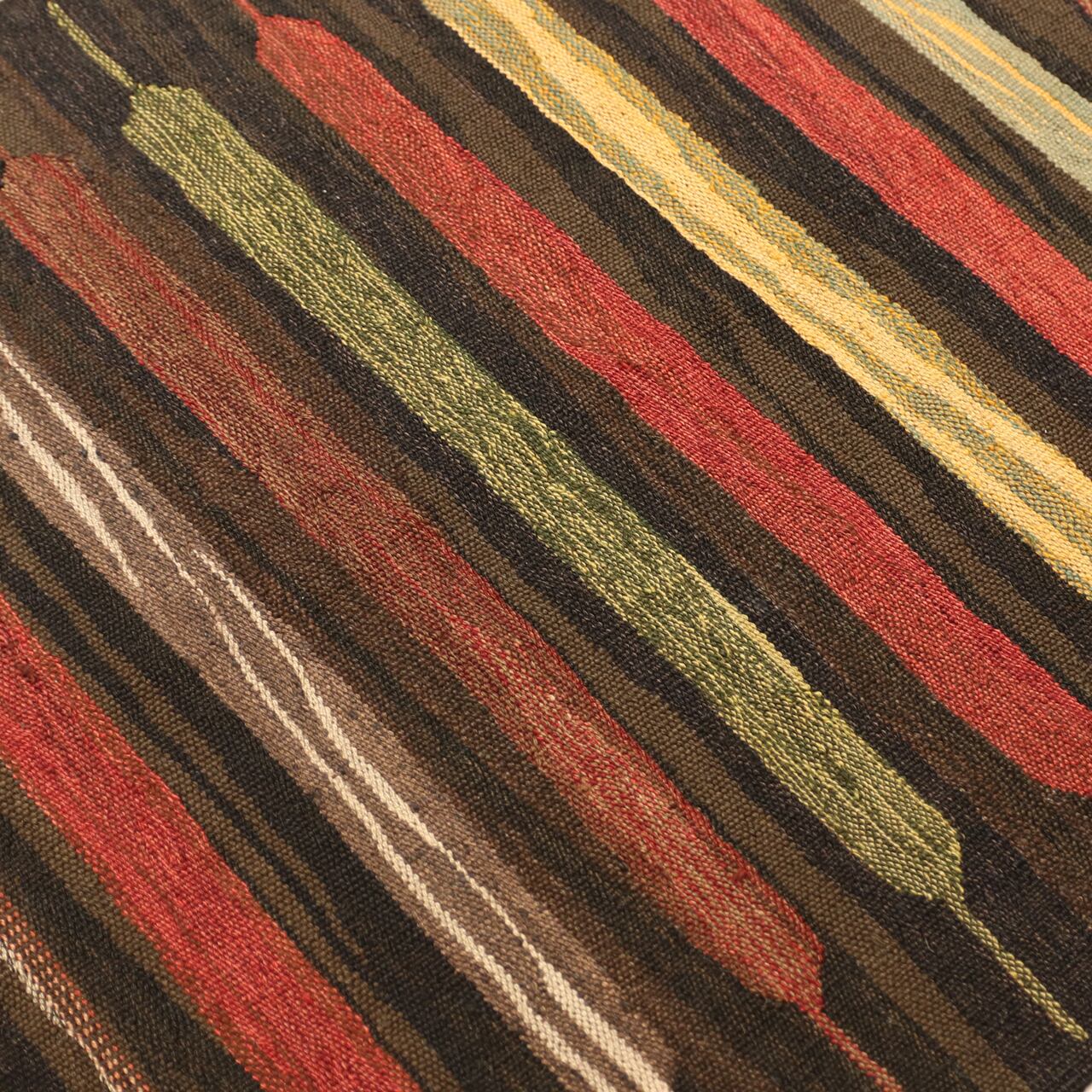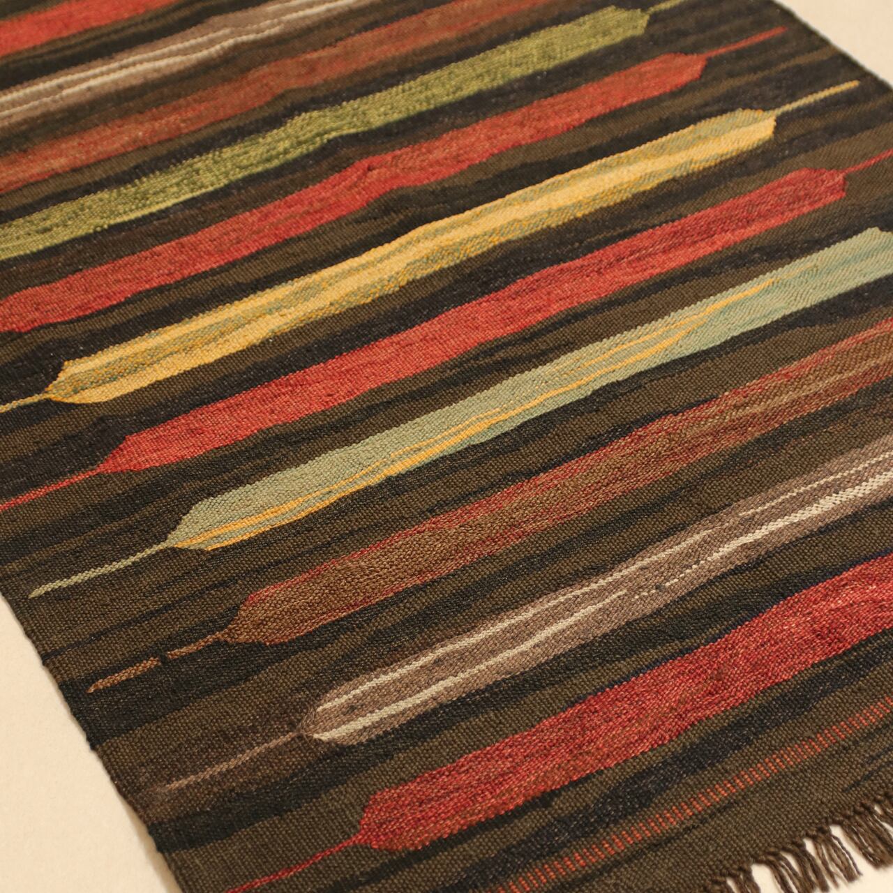 このキリムの文様は「Saff(サッフ)」と呼ばれる矢印を表現した伝統文様で、モダンにデフォルメされ「人々が幸せな方向へと導かれるように」との願いが表現されています。遊牧民にとって、迷うことなく常に正しい方向・進むべき方向“幸せが見つかる方向”を知ることは、とても重要だったのです。そんな願いが込められた縁起の良いキリムです。