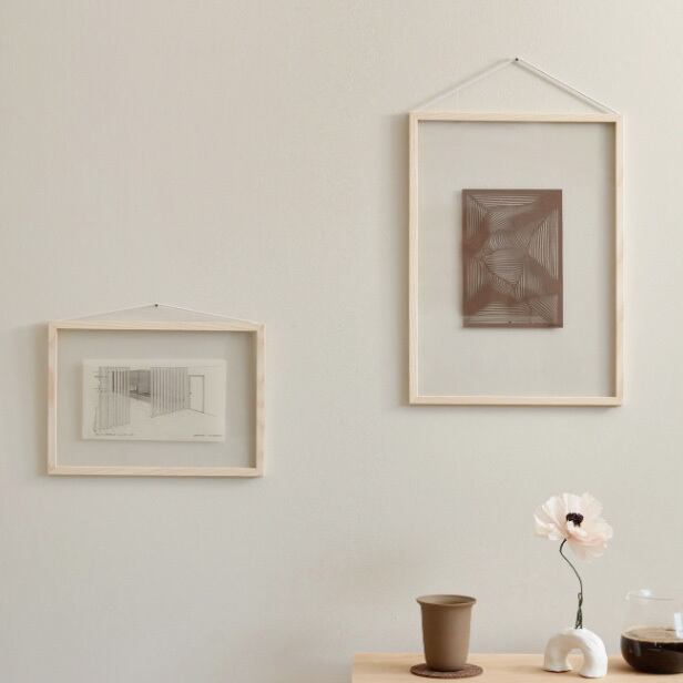 透明なアクリル2枚とのアッシュのフレーム、それらを固定するラバーバンドのみで構成され、細いフレームと透明なデザインによって生み出される余白が、飾るものを引き立てます。
